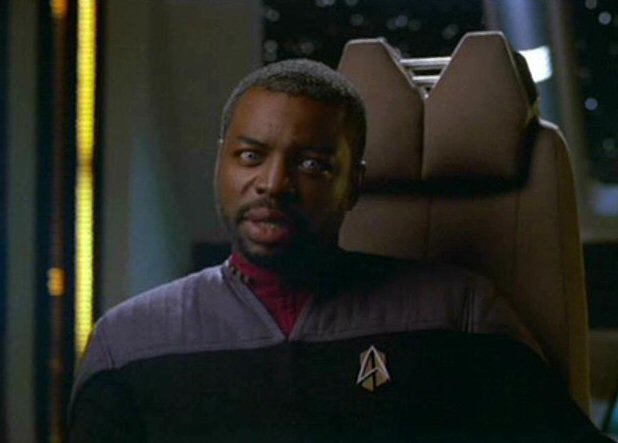 | Starfleet Uniform (circa 2370s) In 2373, the standard Starfleet uniform was again modified, maintaining the same basic shape and division colors, but swapping the colors on the shoulders and turtleneck. The blue-grey shoulder area was now quilted with vertical stitches. The division colors were also displayed on each wrist as a colored hoop. -- Memory Alpha |